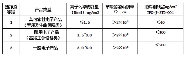 在实际工作中,根除污染实际上几乎是不可能的,一个折中的办法就是确定电路板上的污染可以和不可以接受的程度。按照IPC-J-STD-001标准助焊剂残留三级标准规定<40ug/cm2,离子污染物含量三级标准规定≤1.5(Nacl) ug/cm2,萃取电阻率>2×106Ω .cm