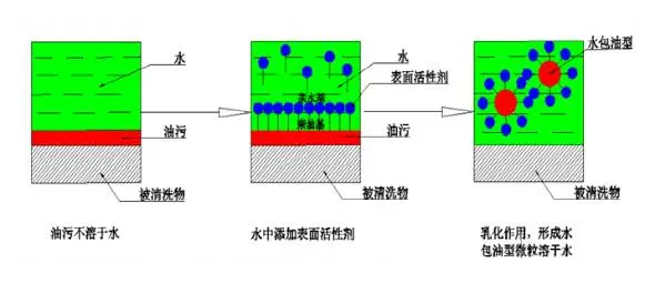 水基清洗剂是借助于含有的表面活性剂、乳化 剂、渗透剂等的润湿、乳化、渗透、分散、增 溶等作用来实现清洗的。根据清洗方向,可分为中性水基清洗剂和碱性水基清洗剂。